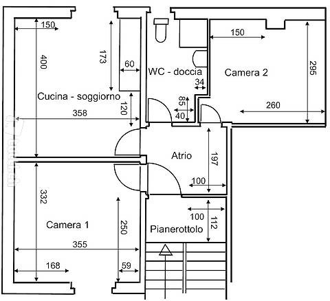 Piccolo appartamento mansardato di 3 locali, situato al 2° piano, così composto: cucina/soggiorno, 2 camere, atrio, WC con cabina doccia.