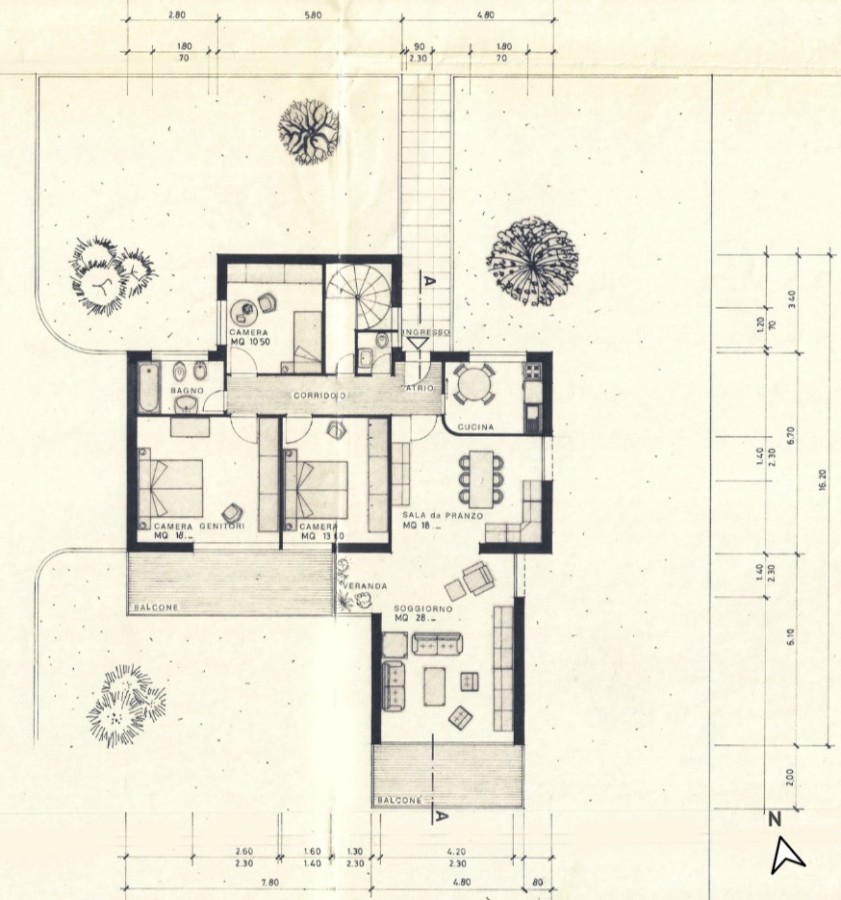 Casa unifamiliare, strutturata su due piani con ampia zona living, cucina, sala da pranzo, 3 camere, due bagni, grottino, garage interno doppio, terrazzi e completa la proprietà il giardino. Una scala a chiocciola interna collega il piano seminterrato al primo piano.